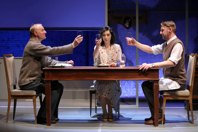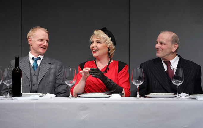 Bazându-se aproape exclusiv pe capacitatea actorilor de a transmite o emoţie naturală şi caldă în acest context artificial, reverenţios şi sec, pariul spectacolului e pierdut din start. Nu poţi empatiza doar cu ideea unui text, atâta timp cât spectacolul menţine o distanţă politicos-condescentă între personaje şi spectator. Tonul constant controlat şi formal ascunde mult prea bine emoţia. Alexandru Potocean (Pierre Vigneau) e motorul din scenă. Încearcă să moduleze trăirile personajului şi relaţiile cu partenerii, dar sarcina îi devine aproape imposibilă între două mutări de mese şi scaune. Richard Bovnoczki (Joseph Haffmann) pare stângaci şi deconcentrat, caută constant un sprijin în expresie şi rămâne la stadiul unei cumsecădenii care nu căptuşeşte suficient emoţiile interioare ce s-ar presupune a fi speciale într-o situaţie extraordinară. De fapt, aceasta e marea deziluzie a spectacolului: o premisă excepţională e aplatizată şi devine un fapt banal. Alexandra Sălceanu (Isabelle Vigneau) pare că îşi controlează mereu intenţia instinctivă de a juca organic, bogat; e mereu atentă să rămână şi ea în limitele strâmte ale unei expozitivităţi ce nu îi e deloc proprie. Andrei Finţi (Otto Abetz) nu are nimic nici din farmecul, nici din forţa seducătoare a unui antagonist. E banal şi civil, iar răsturnarea din finalul spectacolului care îi revine personajului său cade în gol şi nu generează un impact prea notabil. Emilia Popescu (Suzanne Abetz) e singura care animă prin jocul său lejer, locvacitate şi personalitate atmosfera prăfoasă. Scena finală înghesuită nemotivat la o masă pe un colţ de scenă e salvată datorită energiei pe care o infuzează în contrapartidă cu restul senzaţiei de prenteţii nejustificate de până atunci.