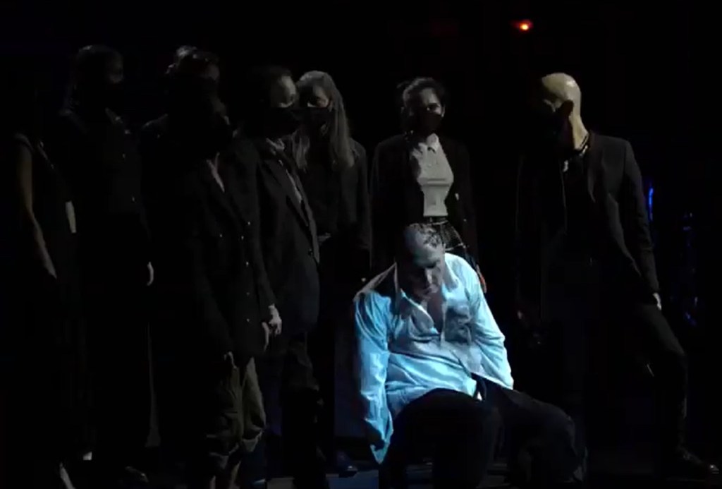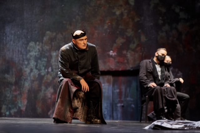 Momentele în crescendo în care Corul construieşte un ritm din ce în ce mai alert, acompaniat de muzica foarte inspirată şi percutantă compusă de Daniel Jinga şi Constantin Aolăriţi – unul dintre cele mai bine definite elemente ale sectacolului, dealtfel – aveau şansa unui impact scenic puternic; dacă ar fi avut precizie. O melopee viguroasă a replicilor egal silabisite într-un recitativ formal nu creează în mod obligatoriu o atmosferă de pericol sau imagini auditive pregnante. Aşa cum nici gestusul nu are relevanţă dacă nu are tăişul unei lame şi e făcut neglijent. Se poate transforma într-un bumerang ce trădează lipsa concentrării şi devine expresia tautologică a unei mişcări descriptive, redundante şi crispante. Efectul cel mai evident al acestui comentariu personal prin gesturi şi interpretare excesivă a cuvintelor în speranţa obţinerii unui efect comic cel puţin ciudat ca opţiune în contextul spectacolului este uşor de identificat în interpretarea lui Adrian Ciobanu (Paznicul). Bufonadele demonstrative aparţin, parcă, altui gen spectacular, iar contraunctul pe care l-ar fi putut aduce este ratat din cauza aceleiaşi generalizări ce aplatizează întregul spectacol.