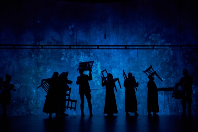 Deasupra unui plan înclinat nouă scaune vechi de lemn atârnă prevestind ameninţare şi rău augur. Spaţiul gol, delimitat în spiritul convenţiei în scenografia lapidară asumată de Maria Miu şi Nina Brumuşilă, predispune la acest amestec de timp şi loc, în care precizia se diluează în favoarea general valabilului periculos de generos. Jumătăţile de măsură se pot intui şi în intenţii şi în forma de expresie. În afară de semnul teatral investit foarte clar prin purtarea măştii pentru a sugera trecerea de la ipostaza de coreut la cea de personaj, convenţia nu contribuie prea mult la impactul acestei trame cu implicaţii apocaliptice. Personajele gravitează pe scenă, se ascultă şi se supraveghează, parcă, dar nu e bine definit din ce ipostază o fac şi cu ce scop. Arbitrarul joacă un rol mult prea important în construcţia regizorală care pare nedumerită în opţiuni: clasic sau contemporan? Şi aşa, şi aşa.