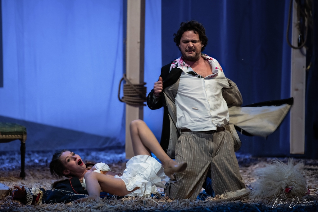 Fără a epata şi fără pretenţia de a fi altceva decât expresia onestă a unui text clasic, reuşita spectacolului depinde şi de putinţele personale actoriceşti; cât de performantă pote fi trupa în a păstra calea de mijloc între tendinţa de caricatură a unor personaje extra-cunocute şi seriozitatea de a juca cinstit situaţii dramatice cu efect comic. Ionuţ Vişan reuşeşte să îl facă pe Rică Venturiano un bufon tragic; cu un întreg repertoriu de gesturi, accidente, repetiţii, o mişcare scenică aparent improvizată, dar al cărei ritm denotă atenţie la detalii, un şarm lejer şi o plăcere de-a joaca serioasă, aerul buimac al acestui crai cu ifose de geniu devine o trăsătură dominantă care îi conduce fiecare acţiune şi toate ineracţiunile din scenă, cu maximul de efect comic şi un strop de emoţie. Andrei Radu îi oferă lui Spiridon două chipuri pe care le schimbă dibaci atât cât să aibă haz. Cu multă sinceritate scenică şi o ascultare concentrată, răspunde şi reacţionează mereu bine proporţionat, iar pe dedesubtul replicilor se poate intui şi complicitatea cu publicul şi motivaţia clară a personajului.