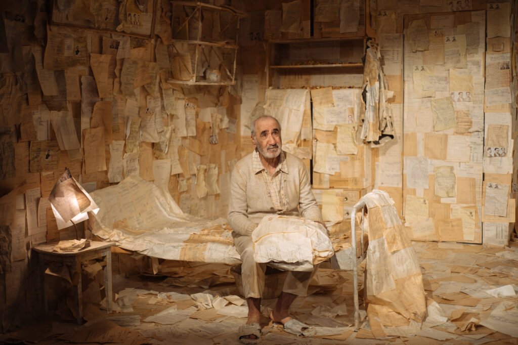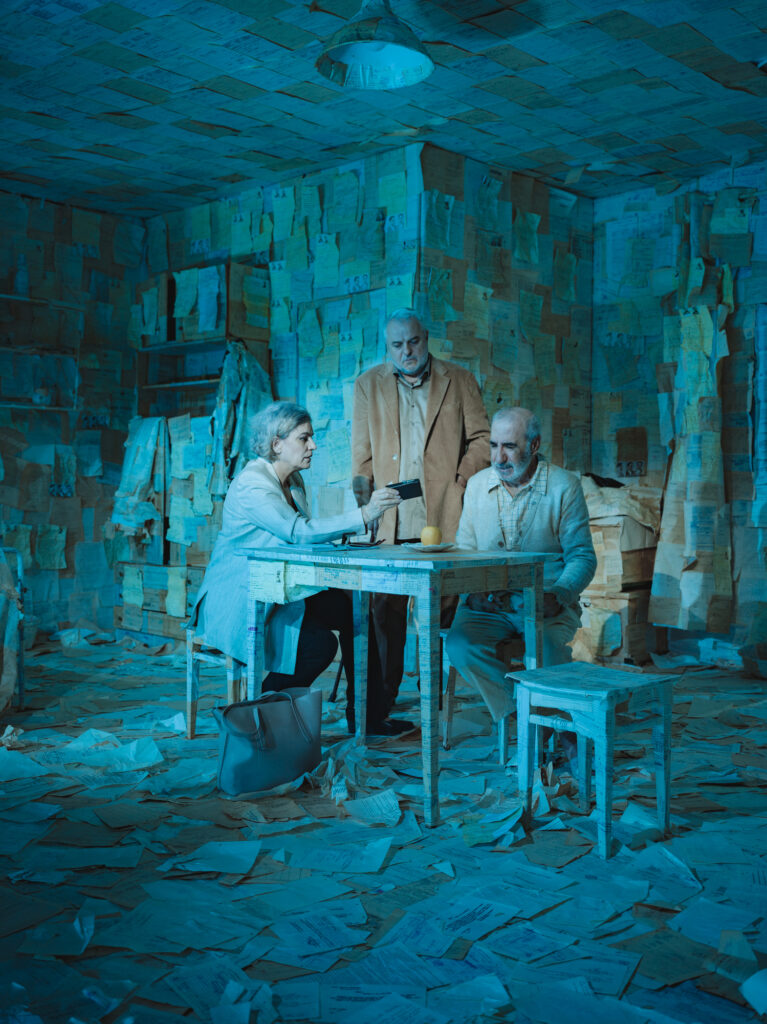 Scenografia conotativă semnată de Adrian Damian reia un safe space pe care pereţii capitonaţi cu foi îngălbenite din dosare politice îl pun sub microcop. Într-un loc comun scos din uzul său colocvial prin semn teatral, cele trei personaje par că fac parte integrantă din lumea filelor mototolie; sunt, la rândul lor, pagini de dosar. Profesorul Fronea Bădulescu – Mircea Rusu – şi Doina Jela – Maia Morgenstern – se decupează ca într-un bazorelief prin contrastul tonurilor închise ale nuanţelor din costum. Franţ Ţandără – Răzvan Vasilescu – însă, e una cu lumea care îl îngroapă de viu şi îi revendică ultimul strop de pace. Video mappingul intervine la răstimpuri bine măsurate drept subtitluri, parcă, ale capitolelor din mărturia fostului ucigaş de la Canalul Dunăre-Marea Neagră şi subliniază vârfurile de intensitate ale chinului rememorării.