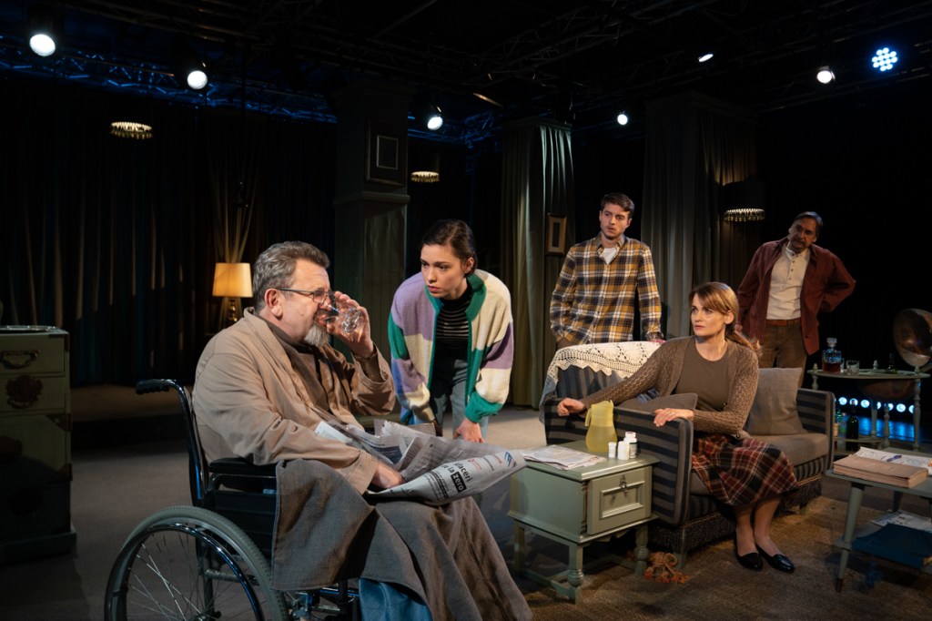 Distribuţia funcţionează precis, ca o echipă bine antrenată, cu reuşite personale deloc surprinzătoare, însă, mereu îmbucurătoare. Adrian Titieni (Tatăl) are o paletă complexă de nuanţe ale comentariilor; e ludic şi stăpân pe mijloacele sale, alternează fluent intensităţile şi îşi jalonează construcţia personajului ca pe un teren accidentat pe care îl parcurge cu siguranţa unui atlet de performanţă. Frica şi neputinţa unui bărbat căruia boala i-a amputat spiritul sunt mascate de hachiţele unui bolnav răutăcios, alintul unui copil mare care dă vina pe familie pentru spaimele proprii. Îl urăşi şi îl compătimeşti totodată şi, cel mai important, îl înţelegi; îţi oferă toate motivele să empatiezi cu el, dar şi să îl dispreţuieşti; e haios, dar şi înspăimântător de egoist – această ambivalenţă constantă e cea mai frumoasă nuanţă a interpretării lui Adrian Titieni.