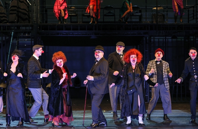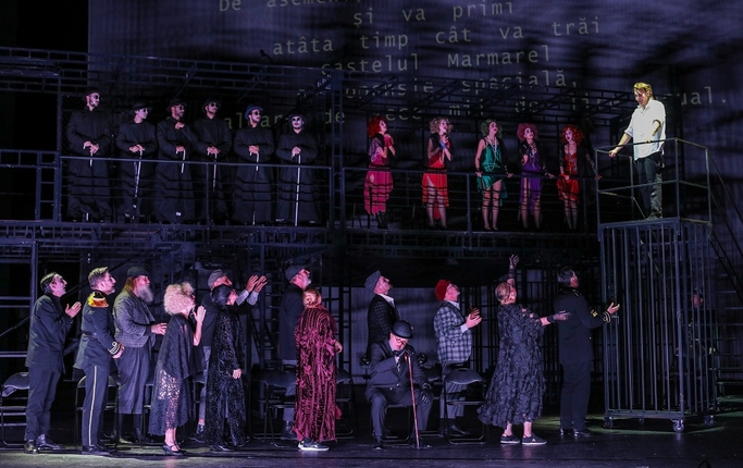 Totul pare foarte previzibil, cu prea puţine momente care să iasă din limitele unei puneri în scenă cuminţi, cu semne de oboseală. O scenografie lipsită de personalitate, funcţională, ce pare împrumutată dintr-un alt spectacol al TNB, care nici nu încurcă, nici nu deranjează; schelăria metalică vopsită în negru e cea mai la-ndemână soluţie care să arate frumos, „interesant”, zăbrelele şi scările creează spaţii de joc folosite tautologic şi expozitiv, iar imaginea per ansamblu se încadrează în aceeaşi notă modestă – cuvântul cheie ce caracterizează acest spectacol. Proiecţiile cu numele songurilor sunt greu lizibile pentru jumătate de sală, capetele actorilor, de asemenea, mascate de reflectoare, pe alocuri, lighting designul are ceva de concert cu buget redus, costumele cerşetorilor citează o „portocală mecanică” virată în zeghe, dar rămâne, doar, la stadiul de citat, perucile actriţelor şi machiajul abundent îngroaşă şi mai mult ideea de caricaturi care, din păcate, nu au nicio legătură cu vria creativă a avangardelor pe care par a le evoca.