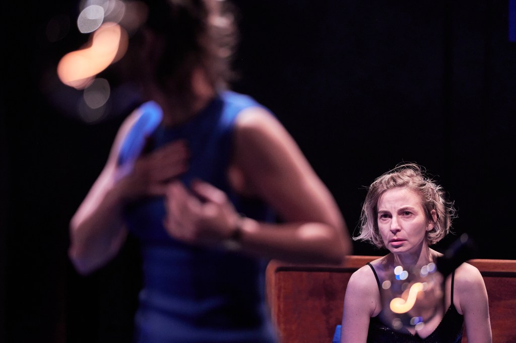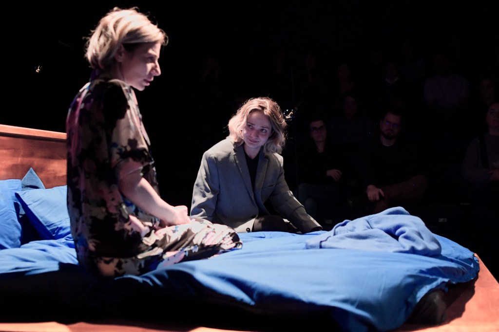 Performanța celor două actrițe de a naviga printre emoții și sentimente care se schimbă brusc odată cu linia temporală frgmentară și convenția atipică constă în autenticitatea relației speculate în cele mai mici detalii. Când sună telefonul în miez de noapte, după zece ani, și răspunzi fără ezitare rugăminții de a-ți primi prietena pierdută, premisele sunt ofertante. Aflăm odată cu Diana, cu răbdare, cu reproș reprimat, cu o curiozitate mocnită, contrariați, cu blândețe austeră, care e motivul pentru care Ema stă acum pe patul cu lenjerie albastră. Acea inconfortabilă stare de jenă, ospitalitatea formală, familiaritatea pierdută și recompusă pas cu pas, întrebările reținute, siguranța de sine aparentă – o gamă amplă de intenții intuite pe dedesubtul interacțiunii ce reînvață limbajul prieteniei se compune din intensitatea prezențelor celor două actrițe. Denisa Nicolae are concretețea de expresie a unei voințe puternice topite în aparența relaxării. Joacă subtil masca femeii independente, care suferă prea puțin pentru pirederea mamei și menționează în trecăt realizările profesionale. E un echilibru fin între ce ne arată din personajul său și ce ne arată că vrea să țină ascuns. Are forță, siguranță de sine, o tehnică bine controlată a jocului de camuflat emoțional și nu anticipează nicio secundă deznodământul surprinzător.