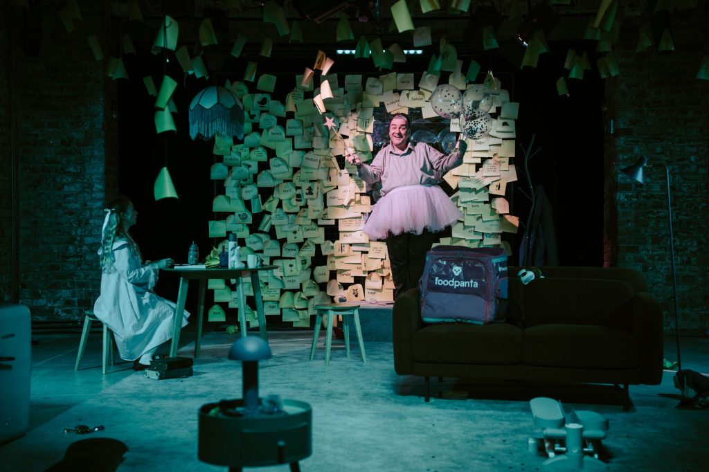 Gabi Costin păstrează constant acea grijă paternă în fiecare ipostază voit caricaturală pe care o atribuie personajelor pe care le interpretează. Cel mai performant moment din spectacol e, poate, dialogul imaginar cu soția absentă, atunci când tristețea personală ce îi sugrumă cu lacrimi vocea trebuie acoperită blând cu jocul de personaje de dragul fetiței lui. Cu micro-expresii, tonuri și gesturi- tic pentru fiecare personaj, într-o alternanță ludică savuroasă, universul bogat pe care îl aduce în scenă e motivul pentru care funcționează până la capăt această propunere de a miza pe emoția unui text aparent scris tocmai pentru a eluda patetismul.